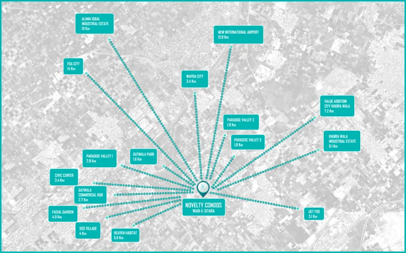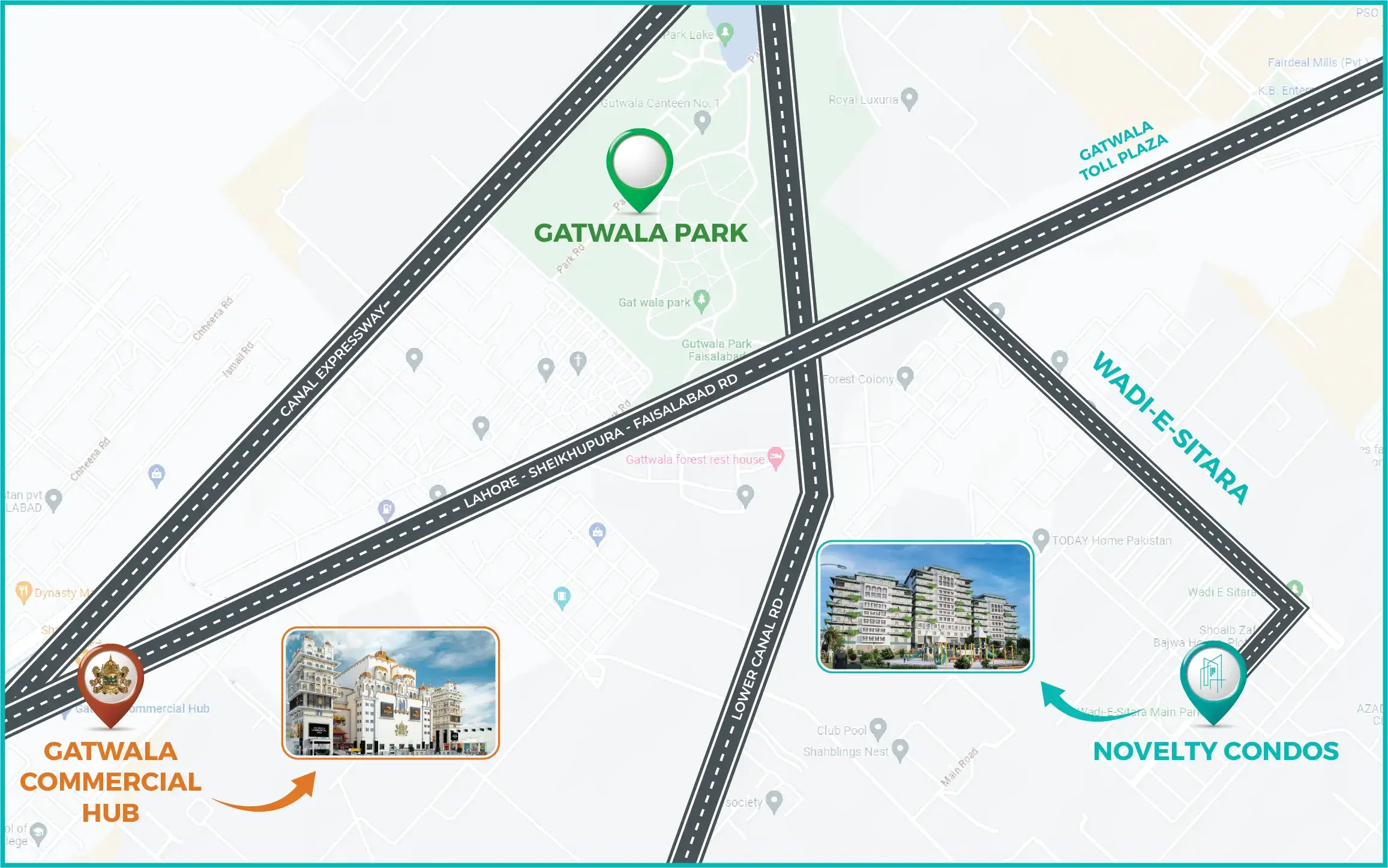 NOVELTY CONDOS and NOVELTY COMMUNITY CLUB offer a picturesque setting in Wadi-e-Sitara, just 4 minutes from Gatwala Commercial Hub. Our location aligns seamlessly with the Master plan of Faisalabad city, assuring our investors that this region is the future of the city, with its ever-growing population.